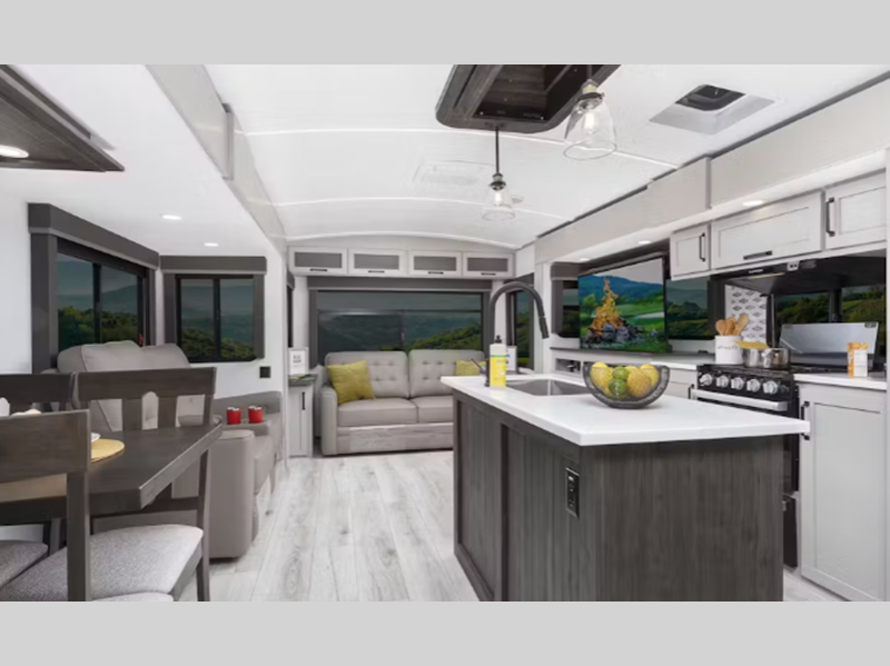 Sleeps 5 Slides 3 Length 36 ft 11 in Ext Height 11 ft 4 in Int Height 6 ft 6 in Interior Color Stone, Tobacco Exterior Color Royal Gold, Obsidian Hitch Weight 1335 lbs Dry Weight 8967 lbs Cargo Capacity 1533 lbs Fresh Water Capacity 54 gals Grey Water Capacity 76 gals Black Water Capacity 38 gals Tire Size ST225/75R15E Furnace BTU 35000 btu Available Beds King Refrigerator Type 12V GE Refrigerator Size 10 cu ft Cooktop Burners 3 Shower Size 34" Number of Awnings 1 Axle Weight 5100 lbs LP Tank Capacity 30 lbs Water Heater Type On Demand AC BTU 15000 btu TV Info LR 50" HDTV Awning Info 13' Power Lighted w/Adjustable Arms Axle Count 2 Washer/Dryer Available Yes Number of LP Tanks 2 Shower Type Radius Electrical Service 50 amp Similar Floorplans