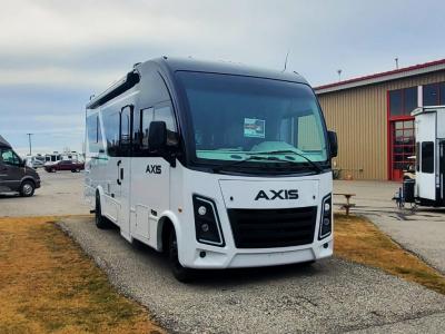 With any Axis Class A gas motorhome by Thor Motor Coach you will enjoy added technology features to make each trip enjoyable, like the RapidCamp+ multiplex lighting and systems control and the Winegard ConnecT 2.0 Wi-Fi/4G/TV antenna. Each model features heated and remote exterior mirrors with integrated side view cameras, reclining and swivel leatherette captain's chairs, and a dash workstation with 110-volt and 12-volt outlets to get some work done if needed. Relaxing after a long day of traveling will be easy with the leatherette furniture, complete kitchen and bath amenities, and 82" interior ceiling height. The HD-MAX exterior with graphics package and black frameless windows provide a sleek look you are sure to love, and don't overlook the lateral arm power awning with integrated LED lighting and lighted rotocast storage compartments for all your gear.