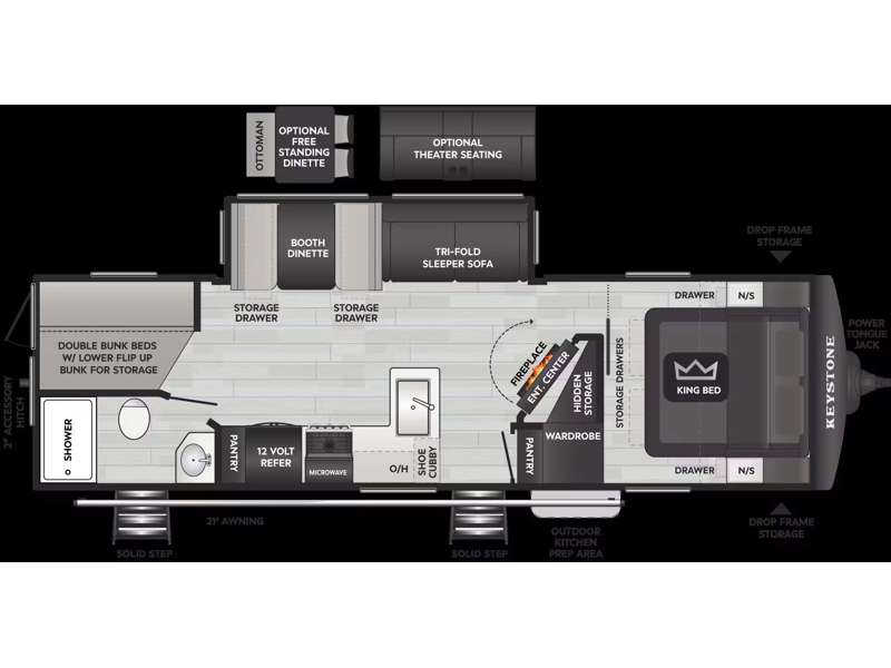 “Smart Slide” Free standing dinette Multi-functional sleeper sofa L-Shape sofa w/ ottoman (327 & 331 only) 2 Swivel rockers 2 Recliners in place of 2 swivel rockers Fireplace (N/A 293 & 324) 15,000 BTU air conditioner Aluminum wheels